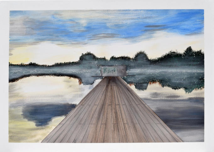 Das Gemälde zeigt eine ruhige Szene am Aasee in Münster mit dem markanten Jorge Pardo – Pier im