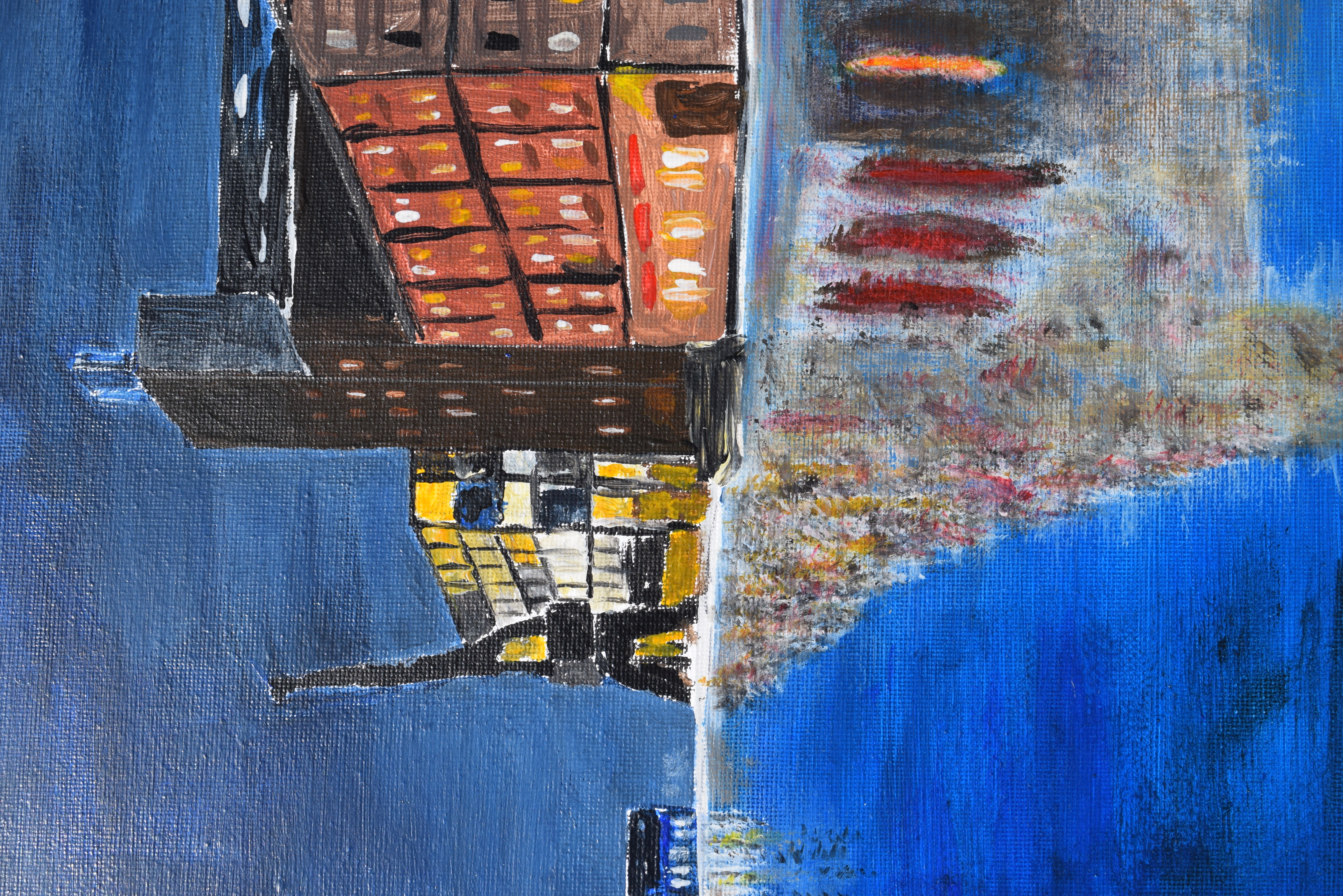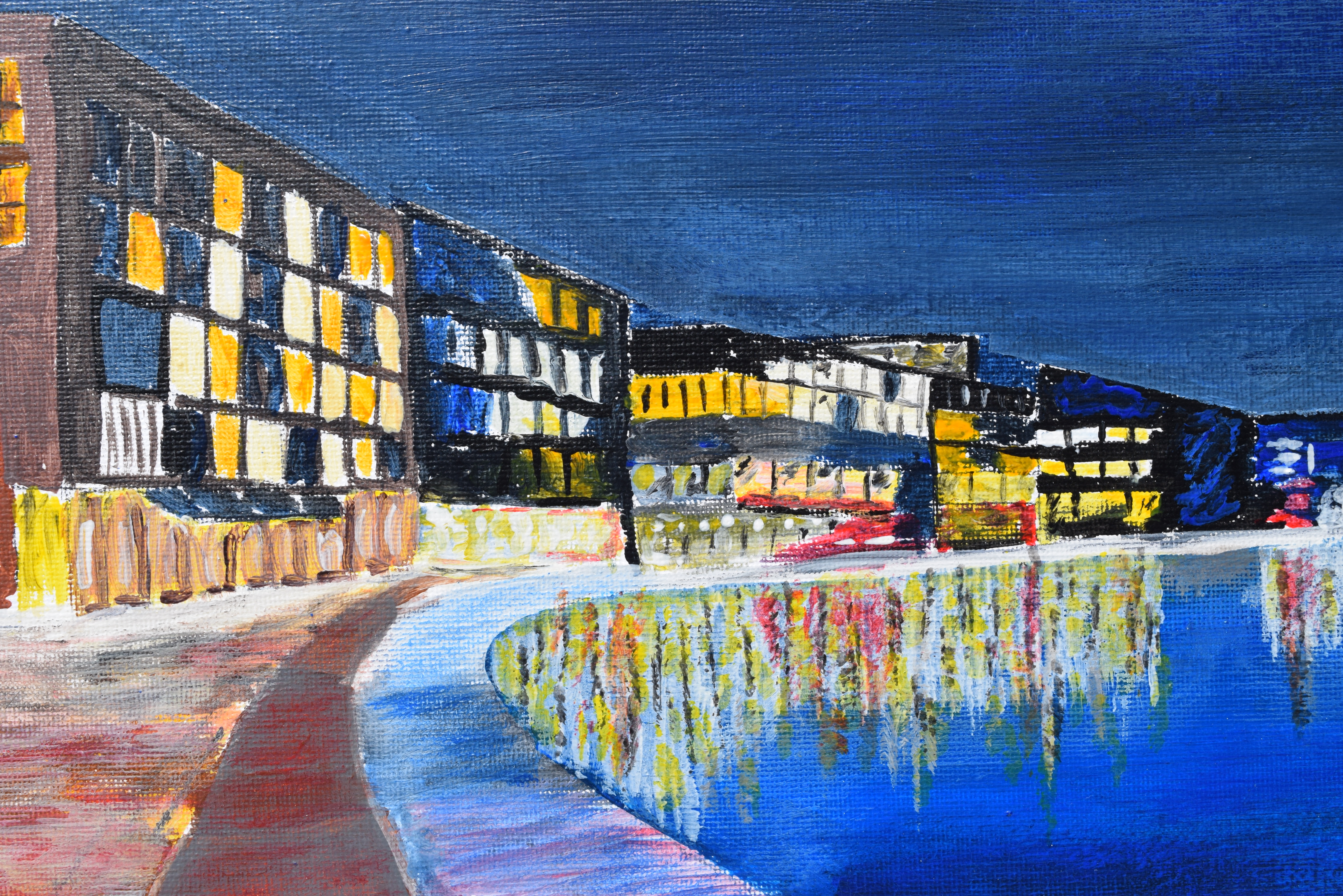 Das Gemälde fängt die besondere Atmosphäre eines nächtlichen Hafenbeckens ein.