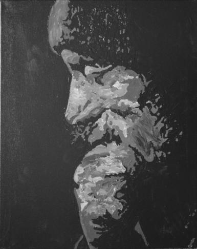 Der Kopf ist stark in den Bildraum gefasst, der Hintergrund hingegen dunkel und abstrakt gehalten,