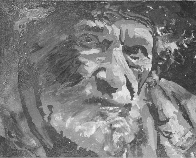 Das Bild zeigt ein expressives, monochromes Porträt eines alten Menschen, das durch seine starken