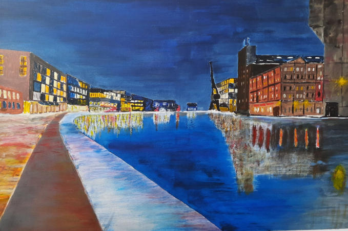 Das Gemälde zeigt eine nächtliche Szene des Hafens von Münster. Im Vordergrund