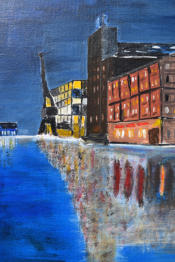 Das Gemälde fängt die besondere Atmosphäre eines nächtlichen Hafenbeckens ein.